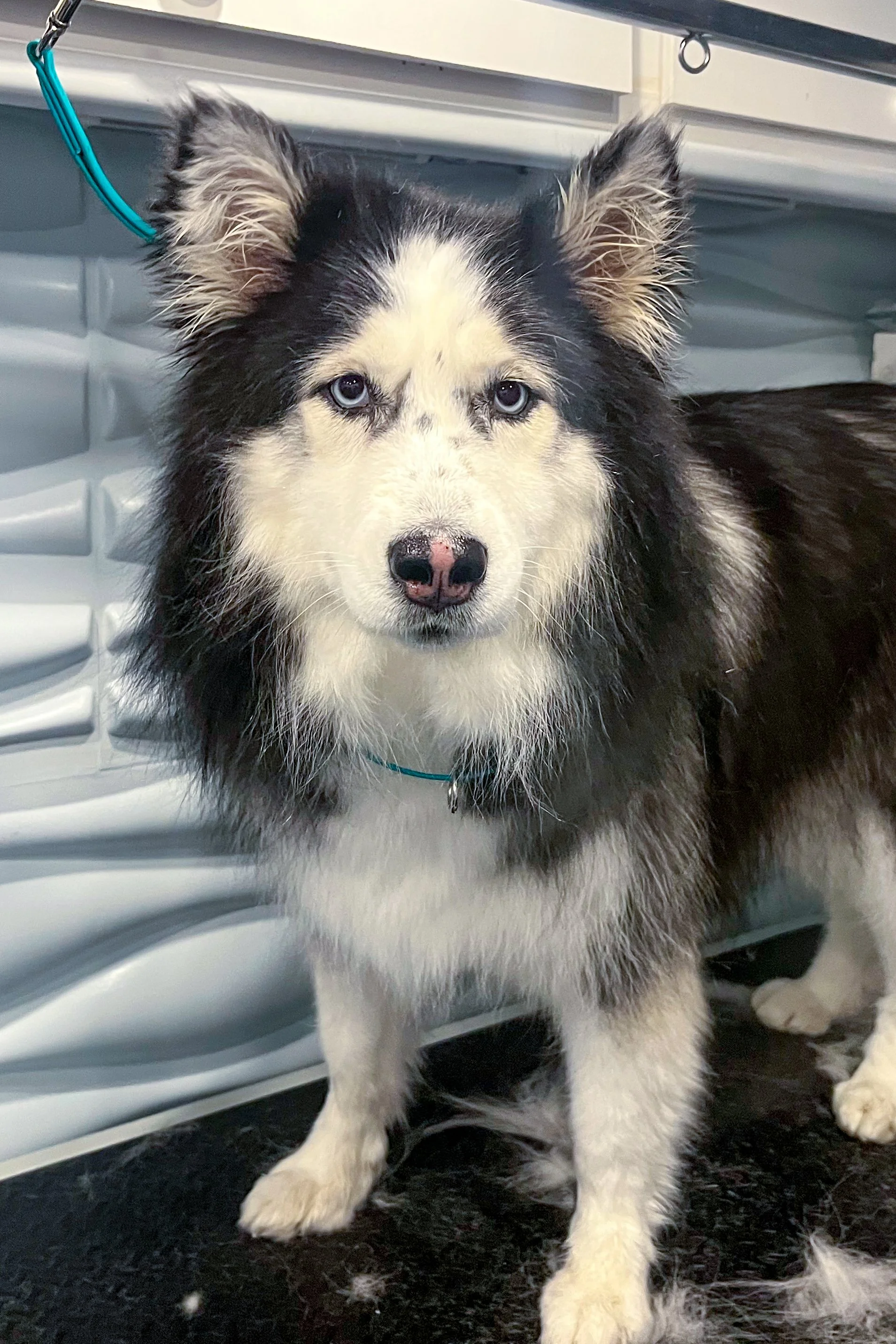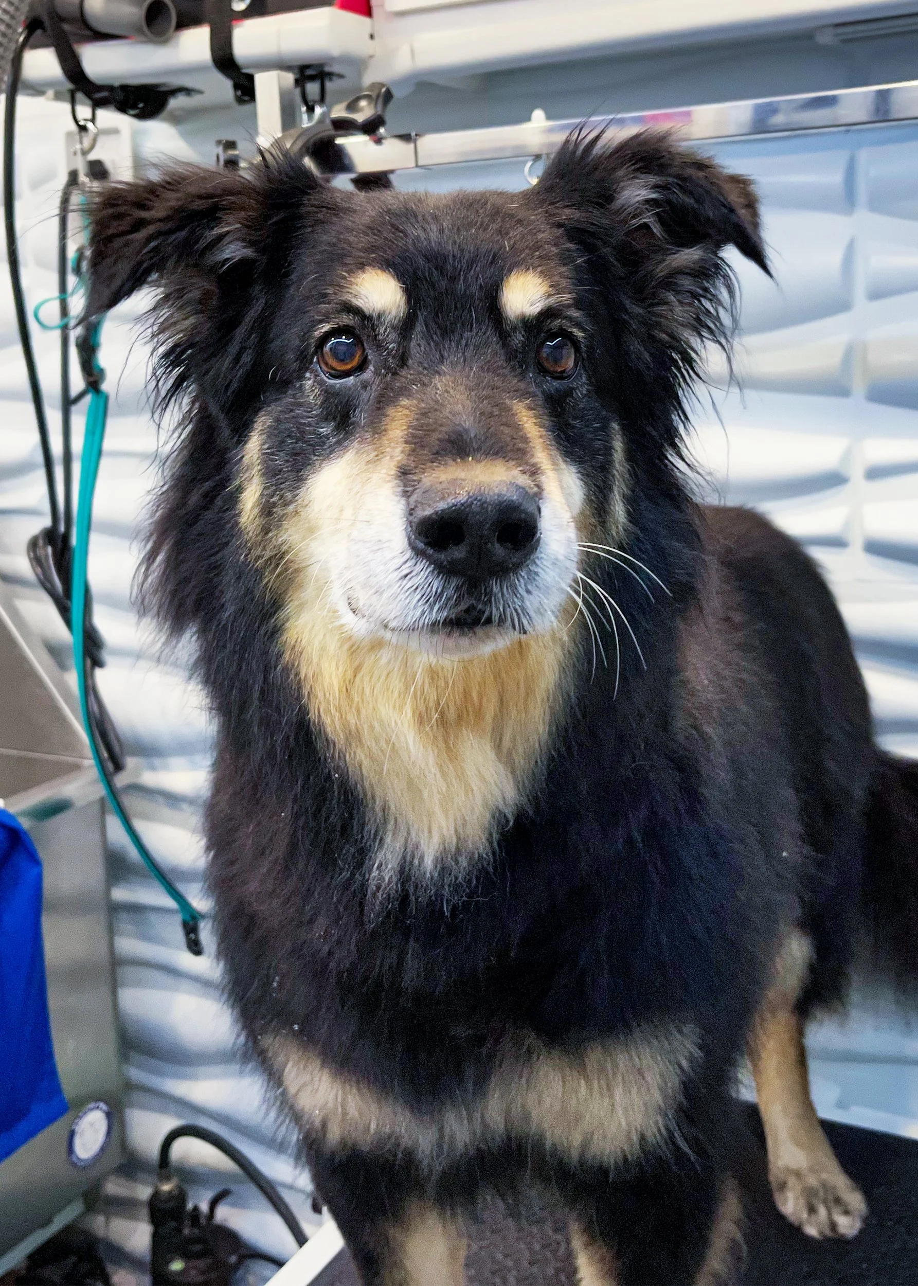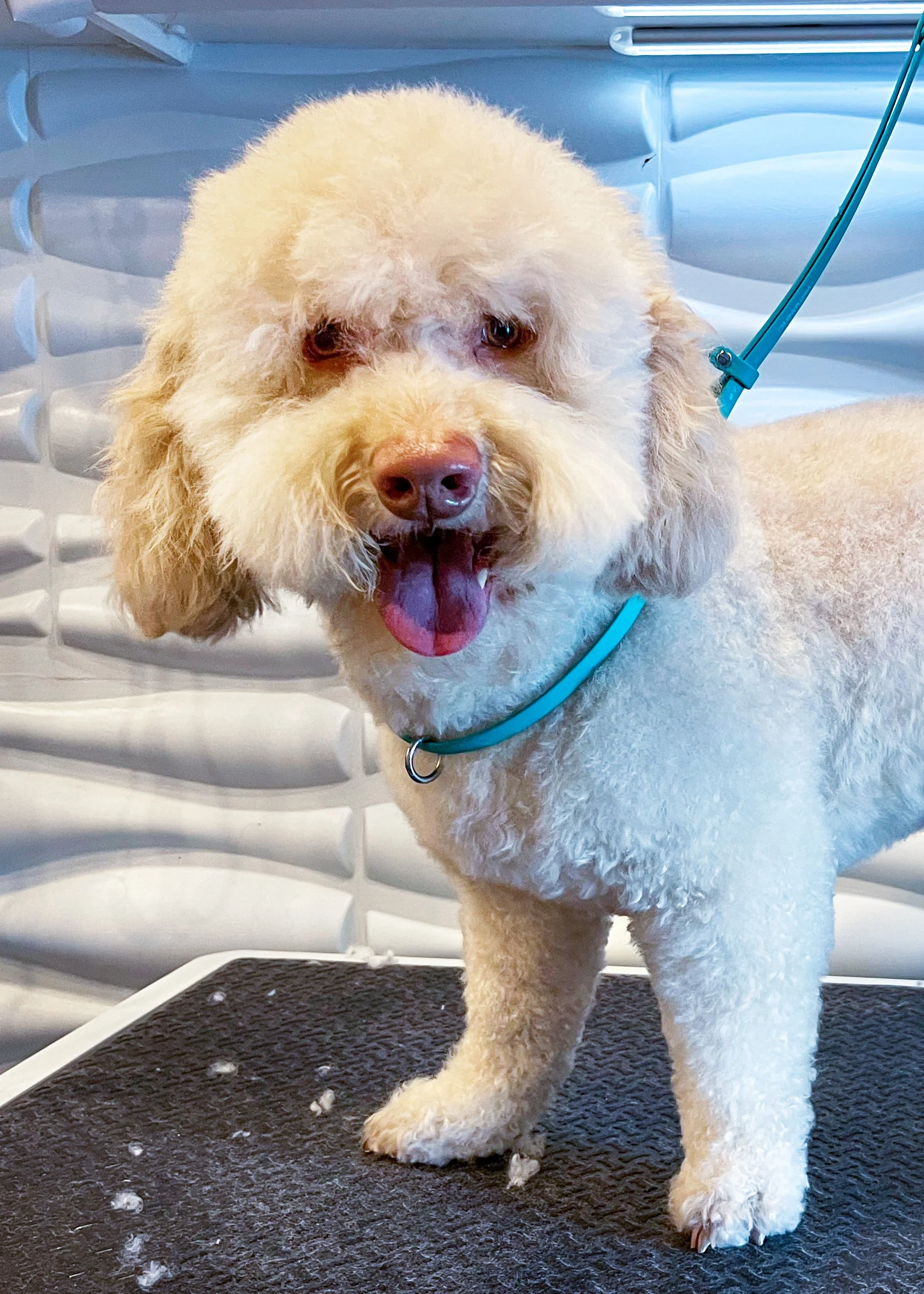 All drying is done by hand. I only use fresh towels and a variable-speed no-heat dryer that allows me to customize your dog's drying experience.